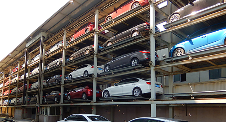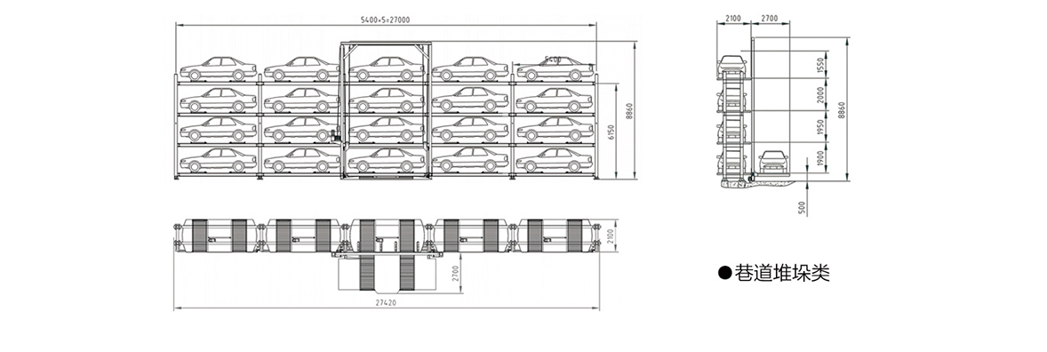 巷道堆垛類停車設備主要通過智能搬運器(堆垛機)沿軌道作三維運動:升降系統提升、道軌移動和輸送機械橫 向輸送將所要存取車輛送到指定位置。可以單邊布置也可以兩邊對稱布置。單邊平行道路巷道堆垛停車設備是充 分利用地下室狹窄空間或是地面馬路旁空地來布置。