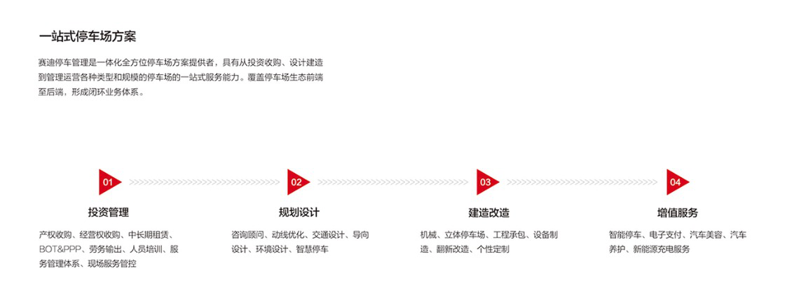 賽迪停車全面引進和吸收日本、德國和中國臺灣地區(qū)自動化停車技術(shù),并針對中國國情研發(fā)創(chuàng)新產(chǎn)品,覆蓋全類型停車設(shè)備設(shè)計及生產(chǎn)能力,已達到了年制造加工12000個車位的生產(chǎn)能力。2017年全面升級轉(zhuǎn)型為一站式智能立體停車服務(wù)供應(yīng)商,覆蓋停車設(shè)計、規(guī)劃、設(shè)備生產(chǎn)、投資及管理的綜合停車企業(yè)。